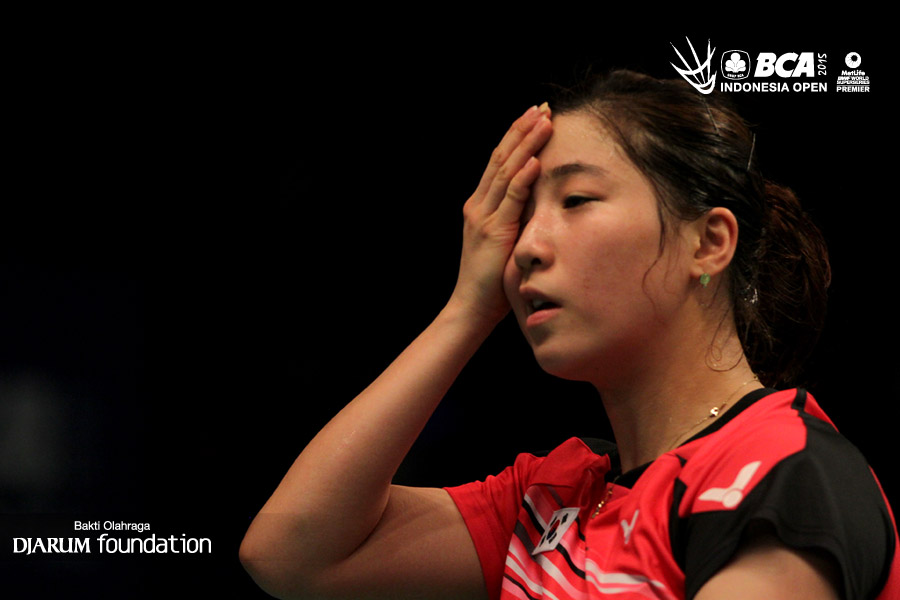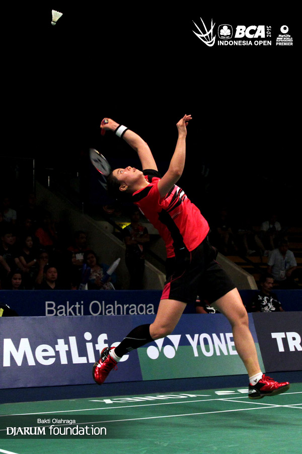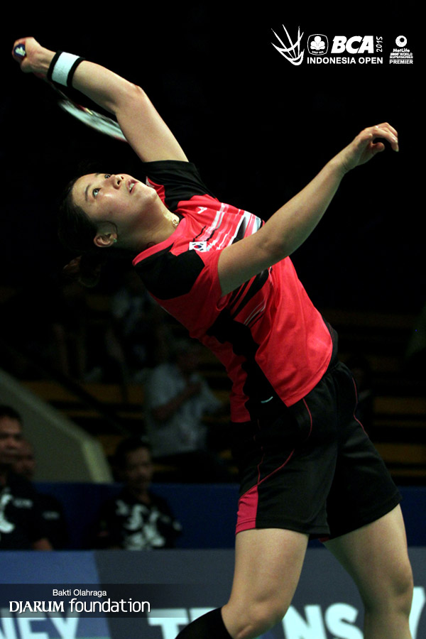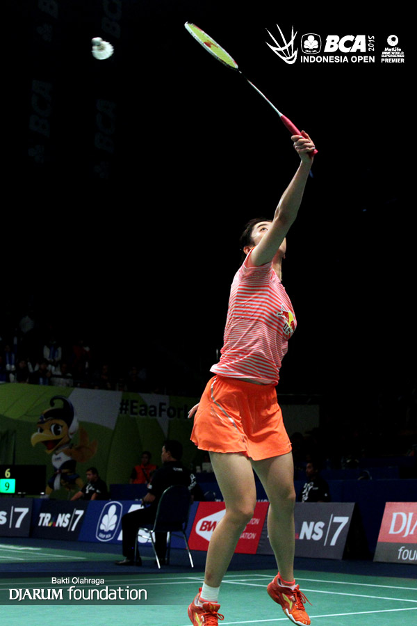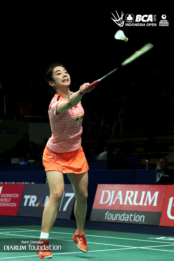 Wang Shixian (China) mengembalikan shuttlecock ke arah Bae Teon Ju (Korea).