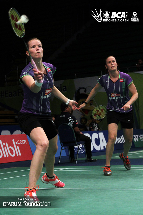 Christinna Pedersen/Kamilla Rytter Juhl (Denmark) mengembalikan shuttlecock ke arah Devi Tika Permatasari/Keshya Nurvita Hanadia (Indonesia).