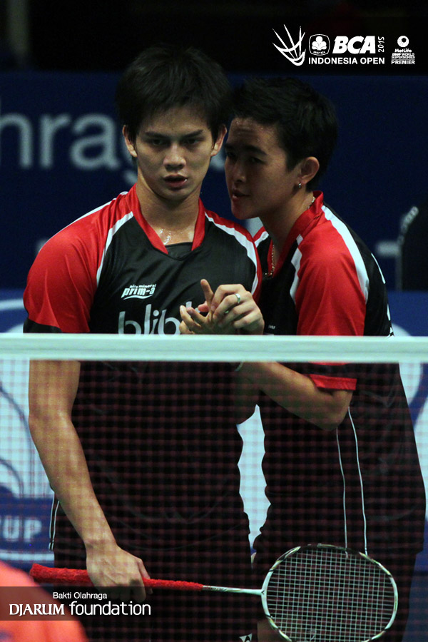 Andrei Adistia/Vita Marissa (Indonesia) saling berkoordinasi.