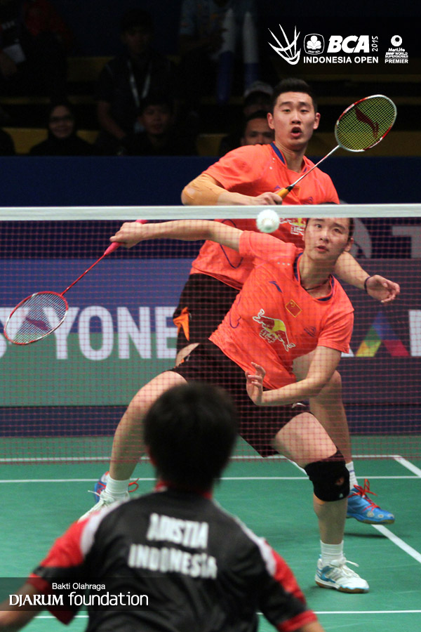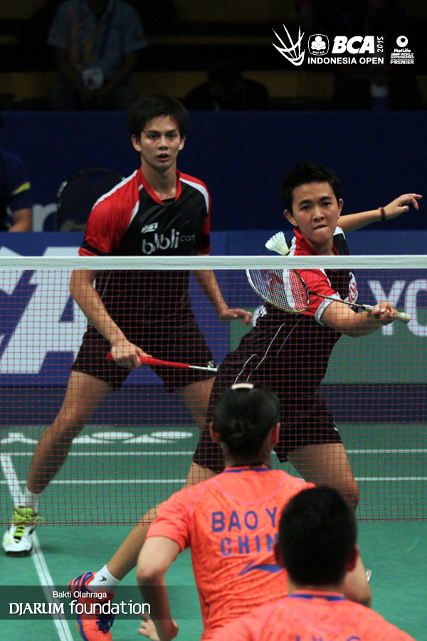 Liu Cheng/Bao Yixin (China) mengembalikan shuttlecock ke arah Andrei Adistia/Vita Marissa (Indonesia).