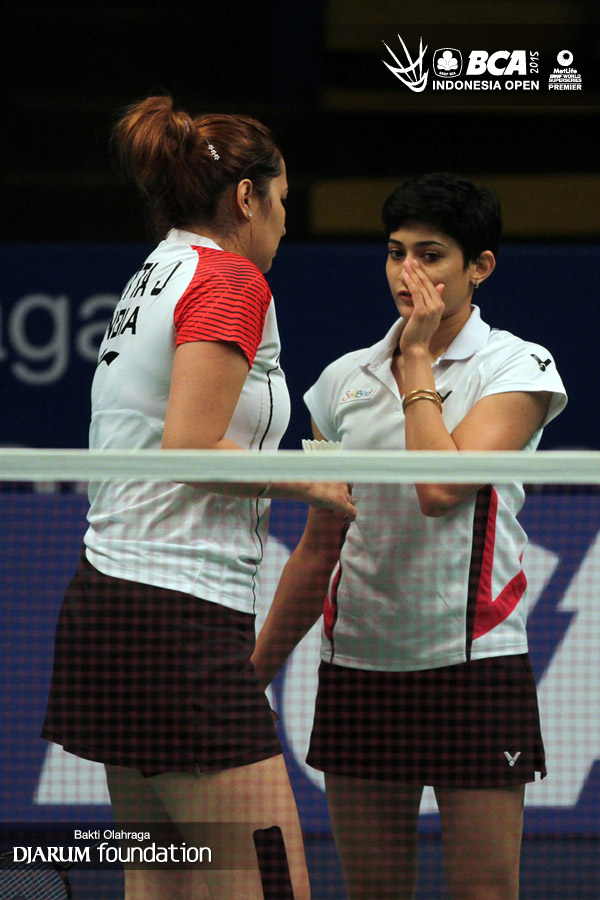Ashwini Ponnappa/Jwala Gutta (India) saling berkoordinasi.