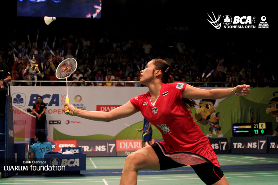 Ratchanok Intanon (Thailand) mengembalikan shuttlecock ke arah Busanan Ongbumrungpan (Thailand).