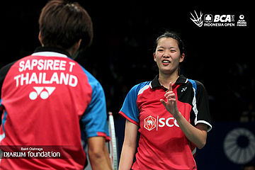 Puttita Supajirakul/Sapsiree Taerattanachai (Thailand) saling berkomunikasi dilapangan pertandingan.