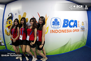 Para usher berpose di pintu masuk utama BCA Indonesia Open Super Series Premier 2015.