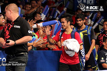 Anthony Sinisuka Ginting (Indonesia) menyambut para penggemar yang telah mendukungnya.