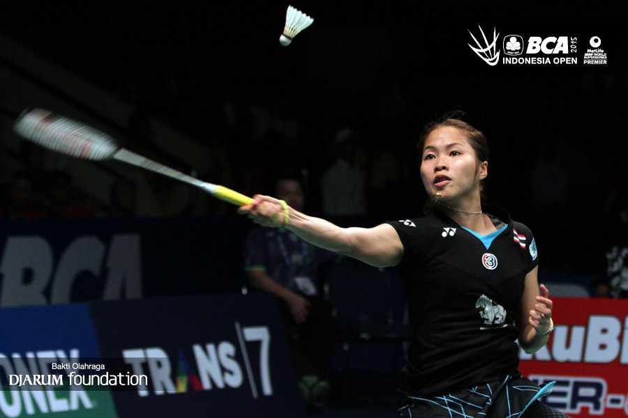 Ratchanok Intanon (Thailand) menyambut pengembalian dari Wang Shixian (China).