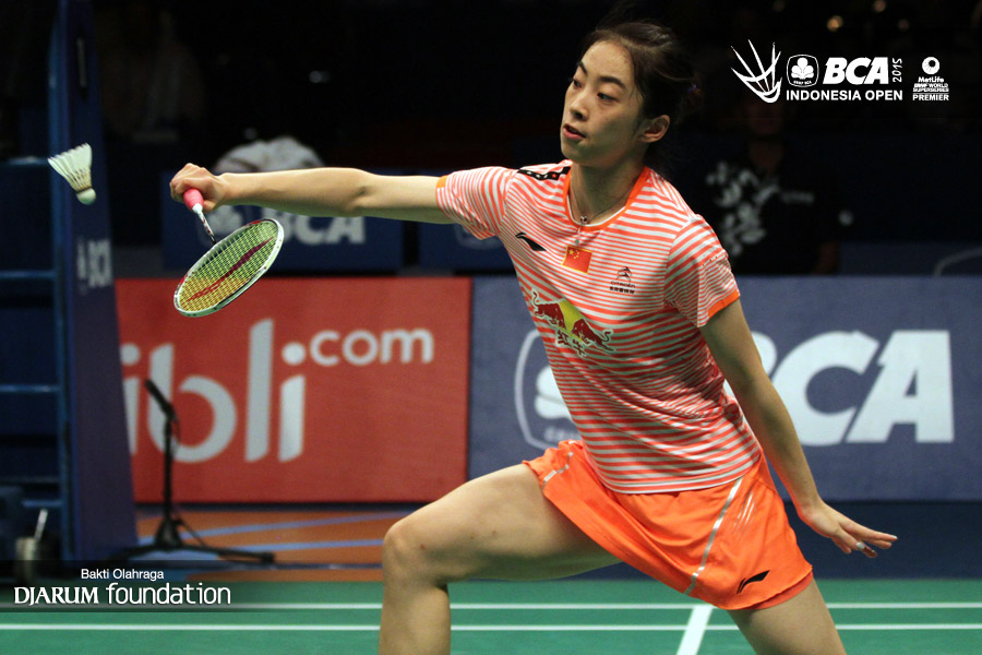 Wang Shixian (China) menyambut pengembalian dari Ratchanok Intanon (Thailand).