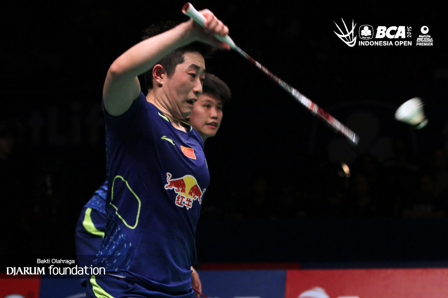 Hendra Setiawan/Mohamad Ahsan (Indonesia) melepaskan serangan ke arah Fu Haifeng/Zhang Nan (China).