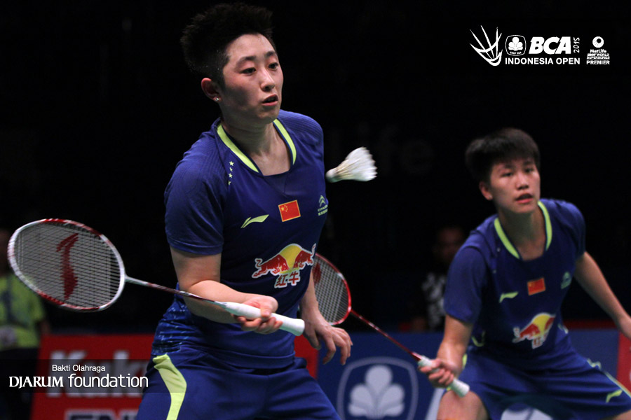 Yu Yang/Zhong Qianxin (China) menghadang serangan yang dilepaskan Greysia Polii/Nitya Krishinda (Indonesia).