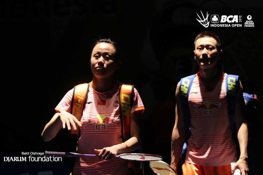 Zhang Nan/Zhao Yunlei (China) berjalan memasuki arena pertandingan.