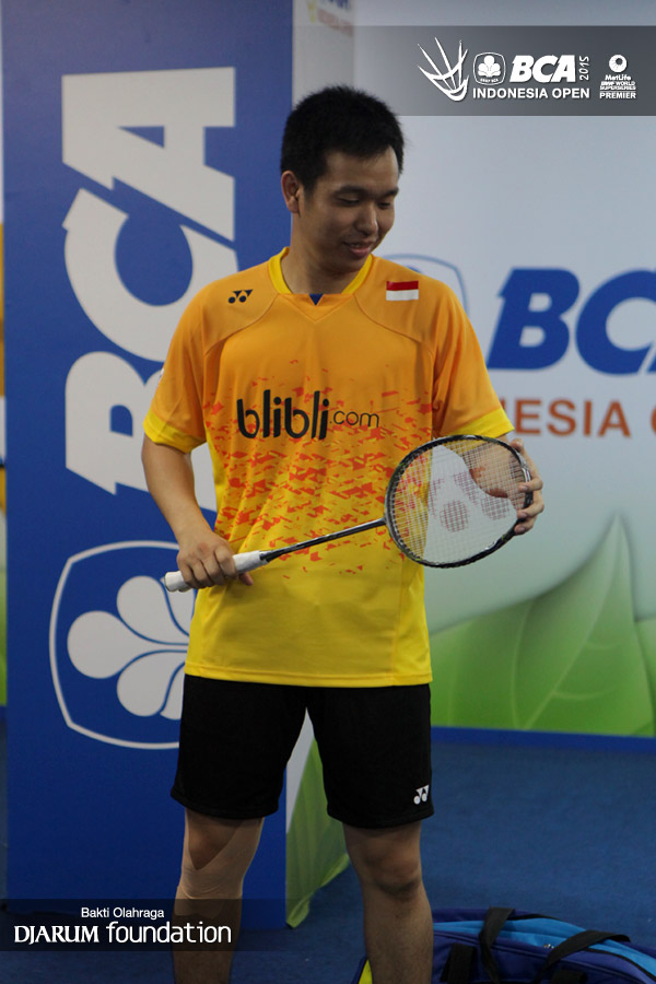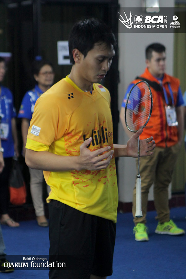 Hendra Setiawan (Indonesia) melakukan pemanasan sebelum bertanding.