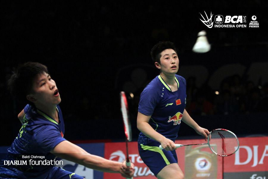 Yu Yang/Zhong Qianxin (China) mengembalikan shuttlecock ke arah Greysia Polii/Nitya Krishinda (Indonesia).