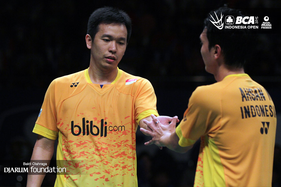 Hendra Setiawan/Mohamad Ahsan (Indonesia) saling menyemangati.