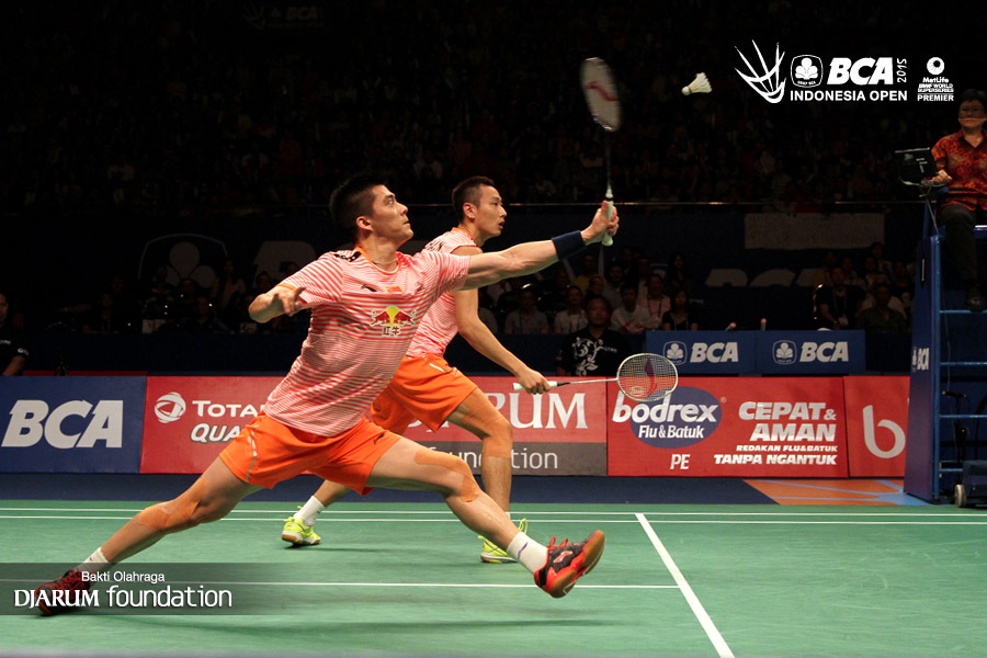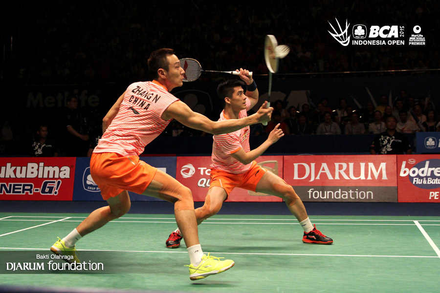 Fu Haifeng/Zhang Nan (China) menyambut pengembalian dari Hendra Setiawan/Mohamad Ahsan (Indonesia).