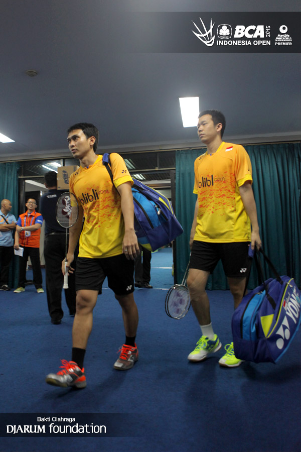 Mohammad Ahsan dan Hendra Setiawan (Indonesia) bersiap memasuki arena pertandingan.