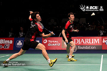 Ko Sung Hyun/Shin Baek Choel (Korea) bersiap menghadang serangan yang dilepaskan Lee Yong Dae/Yo Yoen Seong (Korea).