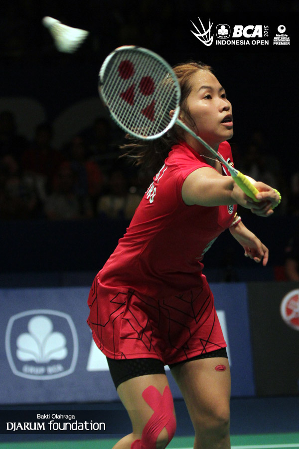 Ratchanok Intanon (Thailand) terjatuh saat berusaha mengembalikan shuttlecock