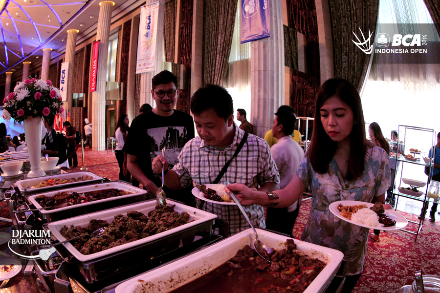Awak media menikmati hidangan pada gelaran Press Conference BCA Indonesia Open Super Series Premier 2016