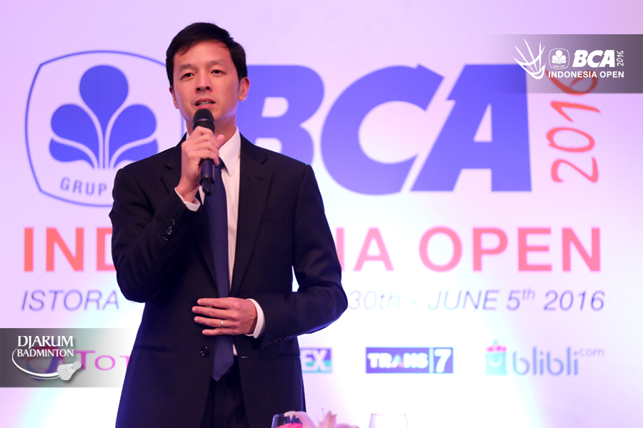 Ketua Panitia Pelaksana BCA Indonesia Open Super Series Premier 2016 Anton Subowo memberikan sambutan