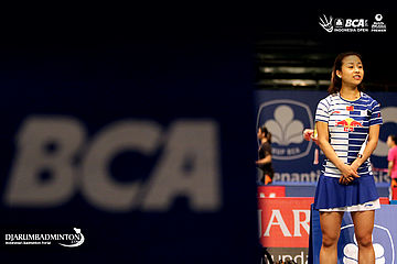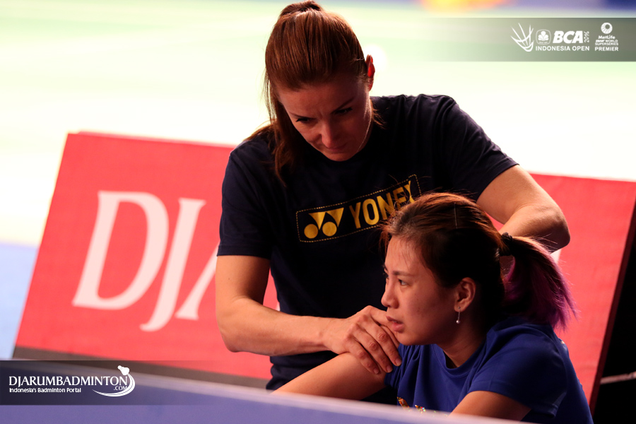 Liu Ying Goh (Malaysia) mendapatkan perawatan fisiotrapis sebelum berlatih
