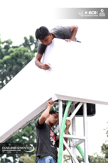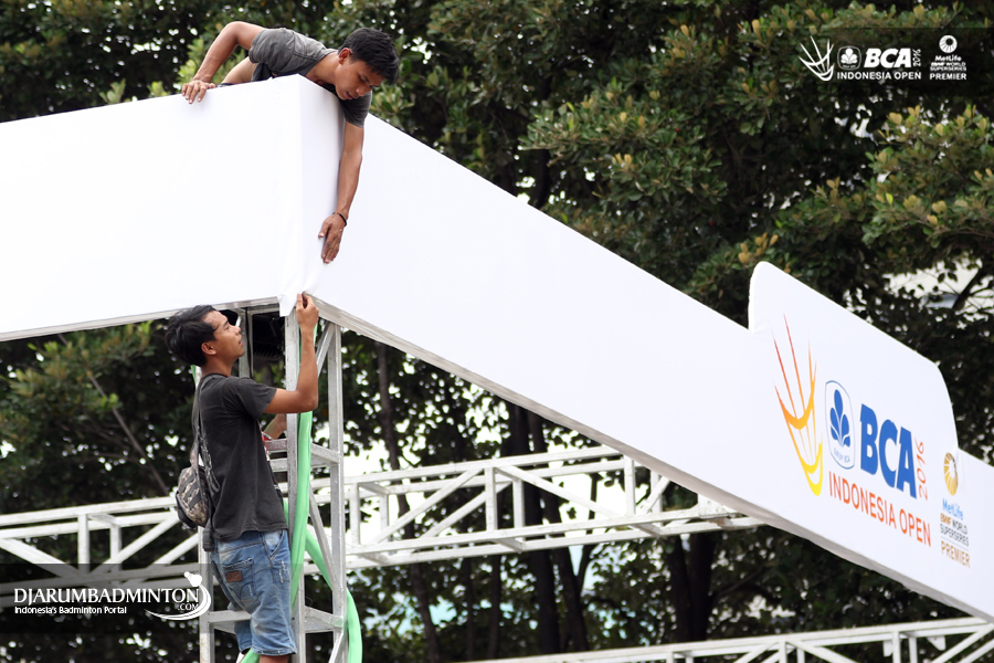 Dua pekerja saat menyelesaikan dekorasi BCA Indonesia Open Super Series Premiere 2016