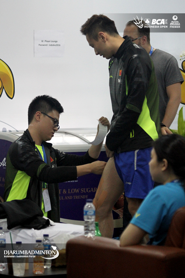 Zhang Nan (Tiongkok) Sedang memakai taping sebelum bertanding