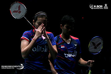 Ekspresi Alfian Eko/Annisa Saufika (Indonesia) saat memenangkan game pertama