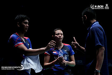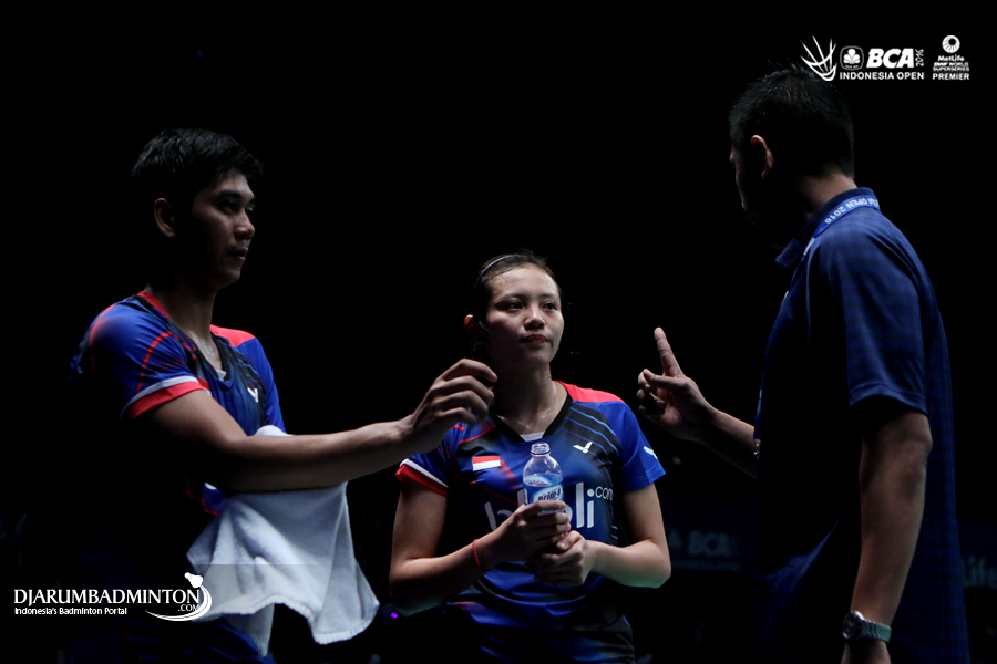 Nova Widianto saat memberikan arahan kepada Alfian Eko/Annisa Saufika (Indonesia)