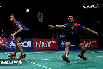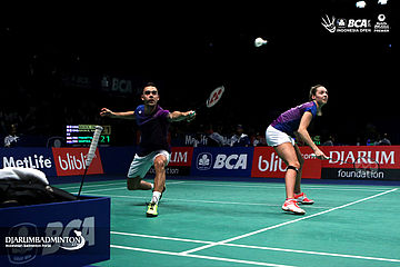 Alfian Eko/Annisa Saufika (Indonesia) mengembalikan shuttlecock
