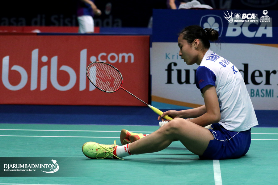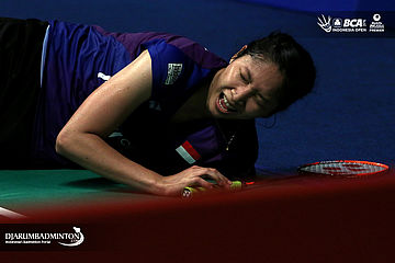 Wang Yihan (Tiongkok) terjatuh saat berusaha mengembalikan shuttlecock
