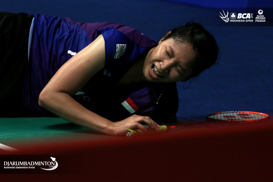 Lindaweni Fanetri (Indonesia) terjatuh saat berusaha menghadang serangan