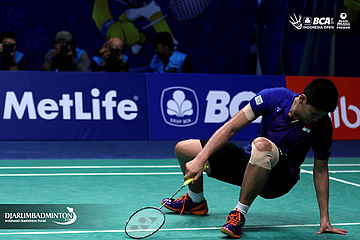 Praveen Jordan (Indonesia) terjatuh