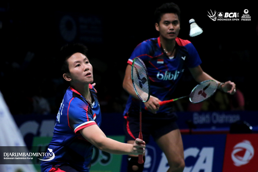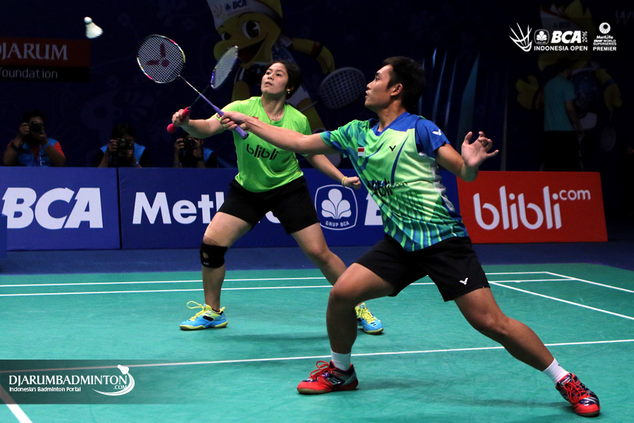 Tontowi Ahmad/Liliyana Natsir (Indonesia) mengembalikan shuttlecock