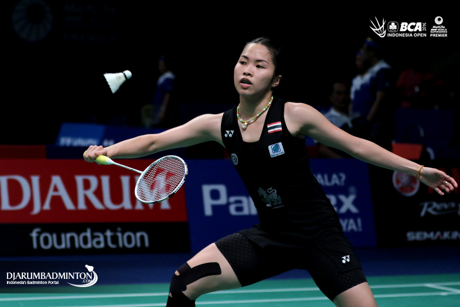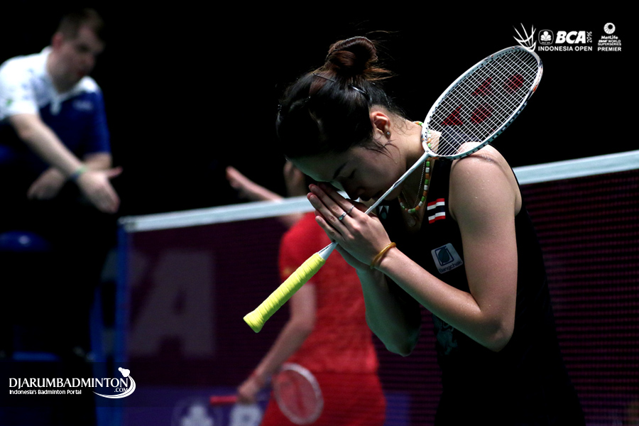 Ratchanok Intanon (Thailand) memberikan penghormatan kepada seluruh supporter yang memenuhi Istora Senayan, Jakarta