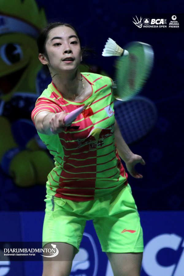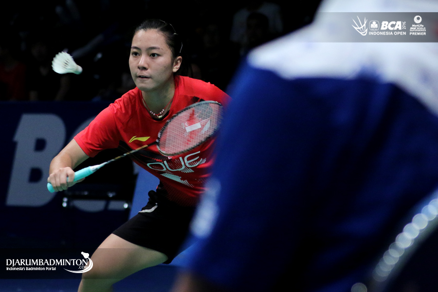 Xiaoyu Liang (Singapura) bersiap menghadang serangan