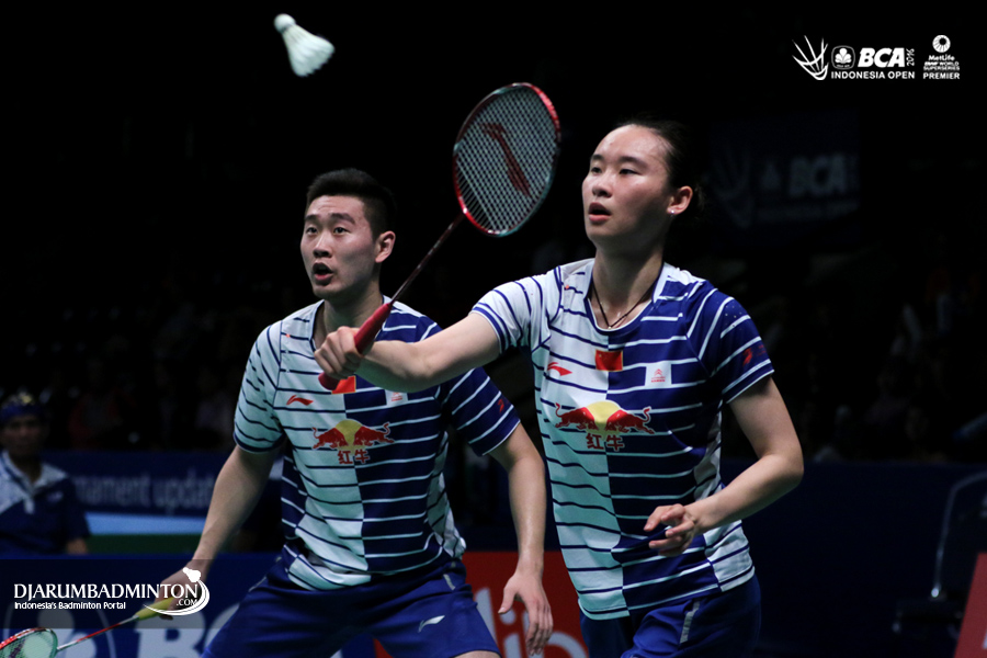 Liu Cheng/Bao Yixin (Tiongkok) mengembalikan shuttlecock