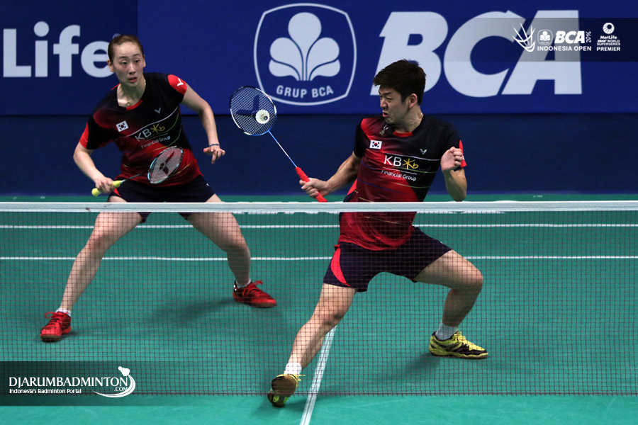 Lee Yong Dae/Lee So Hee (Korea) menghadang serangan