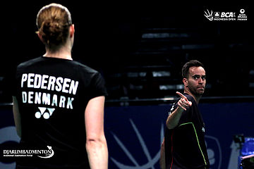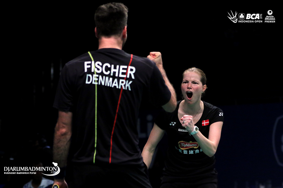 Joachim Fischer/Christinna Oedersen (Denmark) saling memberikan dukungan satu sama lain
