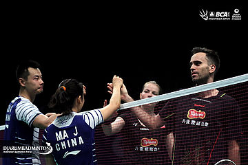 Xu Chen/Ma Jin (Tiongkok) bersalaman dengan Joachim Fischer/Christinna Oedersen (Denmark) usai bertanding