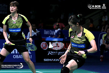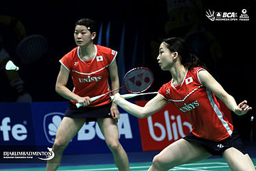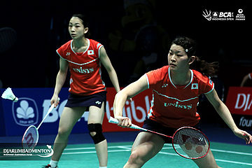 Ayaka Takahashi/Misaki Matsutomo (Jepang) bersiap menyambut pengembalian