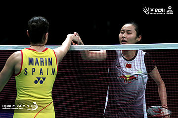 Wang Yihan (Tiongkok) bersalaman dengan Carolina Marin (Spanyol) usai bertanding