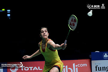 Carolina Marin (Spanyol) mengembalikan shuttlecock