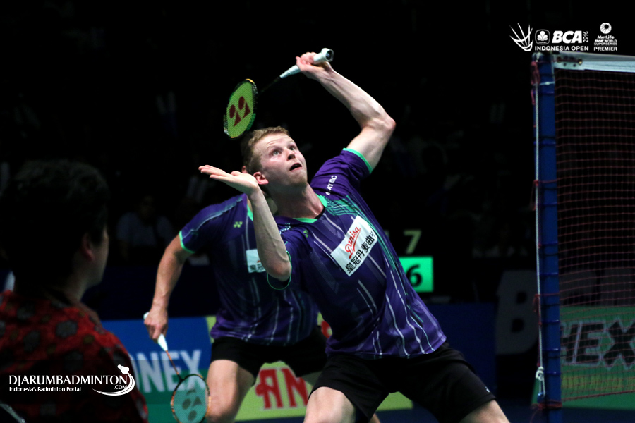 Anders Skaarupasmunssen/Kim Astrup (Denmark) bersiap menghadang serangan