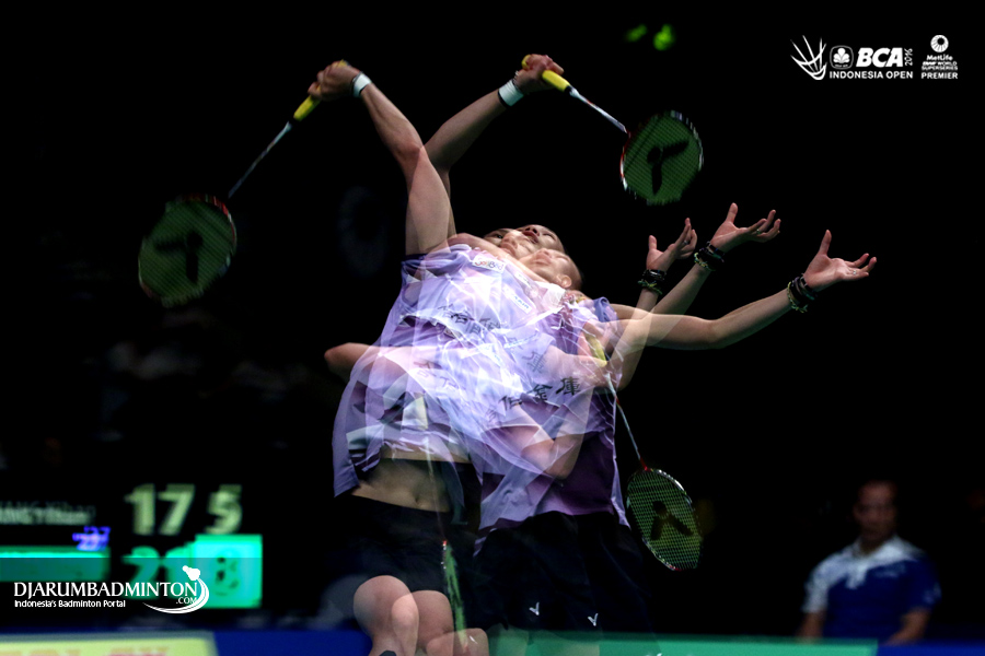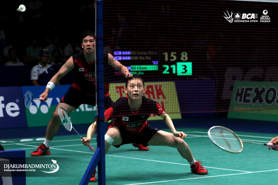 Ko Sung Hyun/Kim Ha Na (Korea) mengembalikan shuttlecock