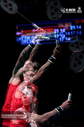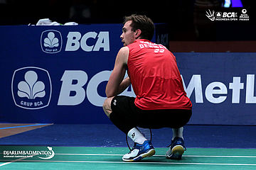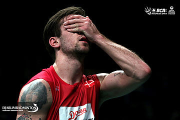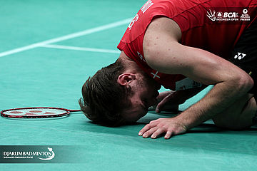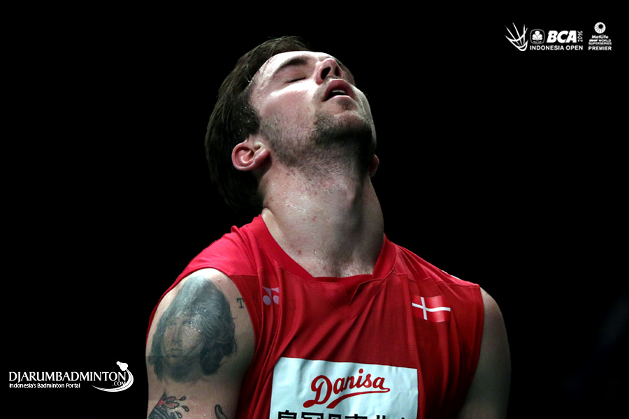Jan O Jorgensen (Denmark) mengembalikan shuttlecock