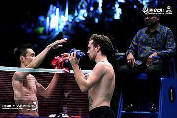 Jan O Jorgensen (Denmark) dan Lee Chong Wei (Malaysia) bertukar jersey usai bertanding