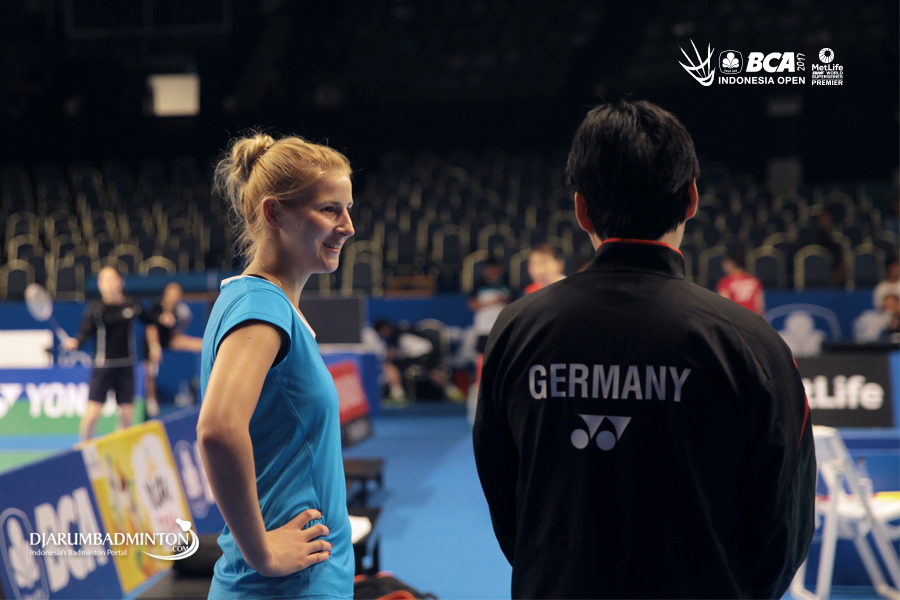 Fabienne Deprez (Jerman) tengah berbincang dengan pelatih sebelum memulai latihan