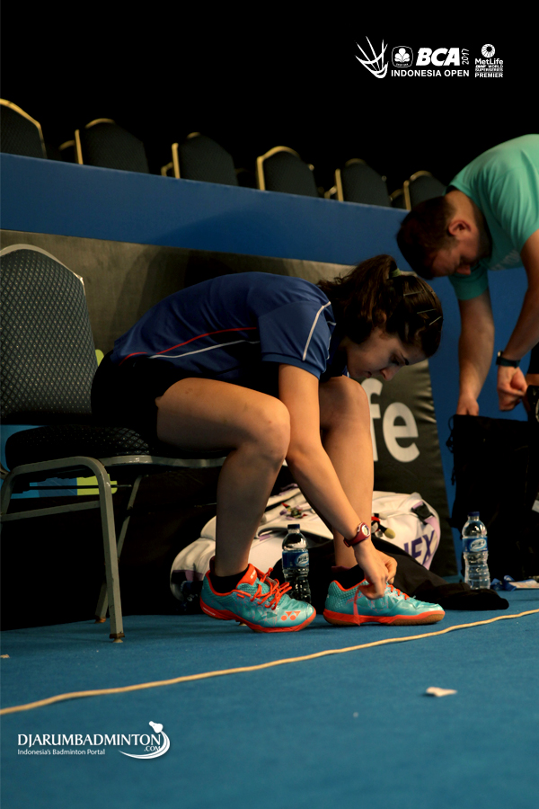 Carolina Marin (Spanyol) tengah mengikat tali sepatunya