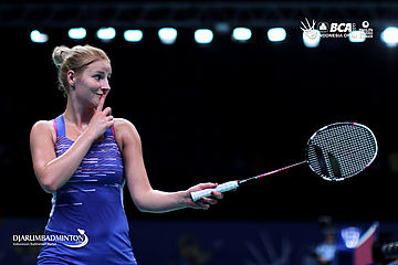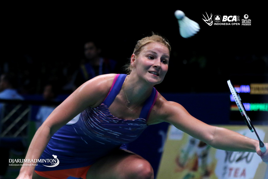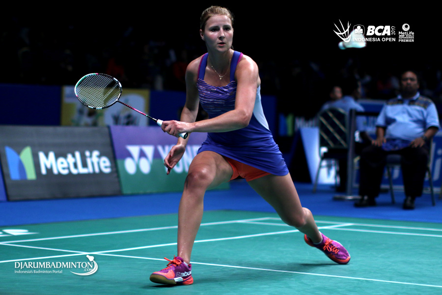 Fabienne Deprez (Jerman) mengembalikan shuttlecock