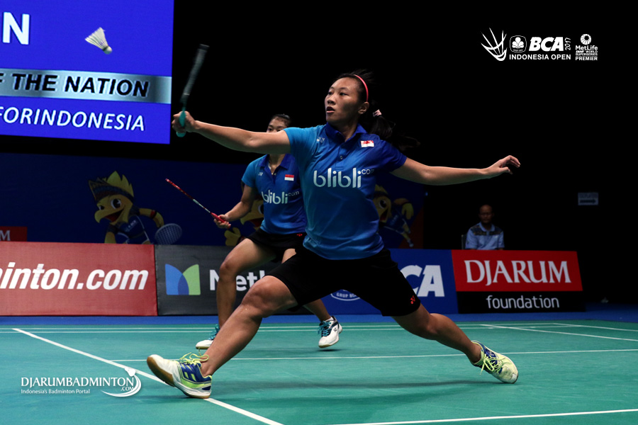 Nisak Puji Lestari/Tania Oktaviani (Indonesia) menghadang serangan.